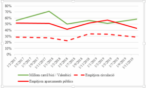 Així doncs, passats ja uns quants anys des de l’inici de les controvertides reformes de mobilitat, és un bon moment per analitzar l’evolució de l’opinió pública local. El carril bici, però, només és part d’un entramat d’actuacions la coherència de les quals depén de la seua aplicació completa: a la instal·lació de vies ciclistes, se li afig la reducció d’aparcaments i carrils per a vehicles a motor. És a dir, analitzar l’impacte d’un és impossible sense considerar l’impacte sobre l’altre. Considerem adequat, doncs, comparar la percepció sobre aquells tres elements de la mobilitat urbana que entren en conflicte directe: la bicicleta, el vehicle privat i l’aparcament.