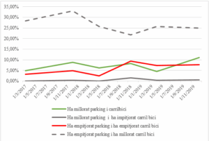 En el primer cas, la percepció majoritària és que millora la gestió del carril bici, però empitjora el servei de l’aparcament, tot i que d’assolir vora un 35%, s’ha estabilitzat al final del període en un 25%. Mentrestant, aquells que pensen que tots dos han millorat creixen per damunt del 10%. Pel que fa al grup més negatiu – empitjoren tots dos – arriben al 10% en un determinat moment, però després baixen i s’estabilitzen per davall d’aquesta xifra.